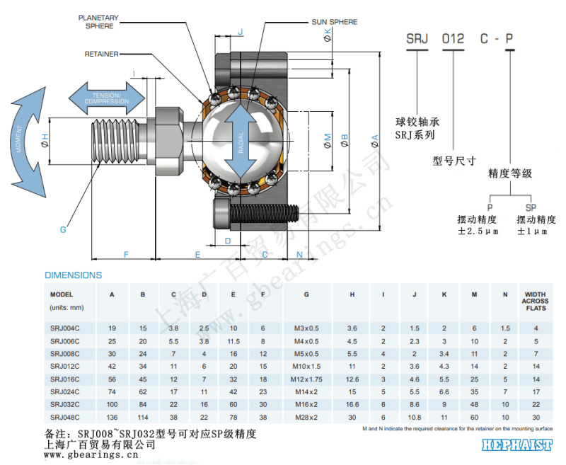 上海廣百貿易有限公司主要銷售:日本HEPHAIST球鉸軸承 HEPHAIST球面滾動接頭軸承 HEPHAIST萬向球進口軸承 HEPHAIST軸承代理商。SRJ006CP 多自由度軸承小型化,零間隙滾動導向所實現的高剛性、高精度。